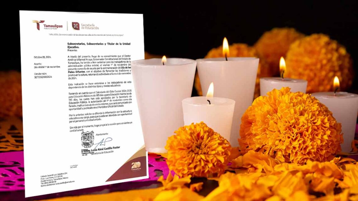 Ciudad Victoria, Tamaulipas.- La titular de la Secretaría de Educación en el estado Lucía Aimé Castillo Pastor informó que el próximo día primero de noviembre fue declarado como día de asueto por la conmemoración del Día de los Fieles Difuntos.