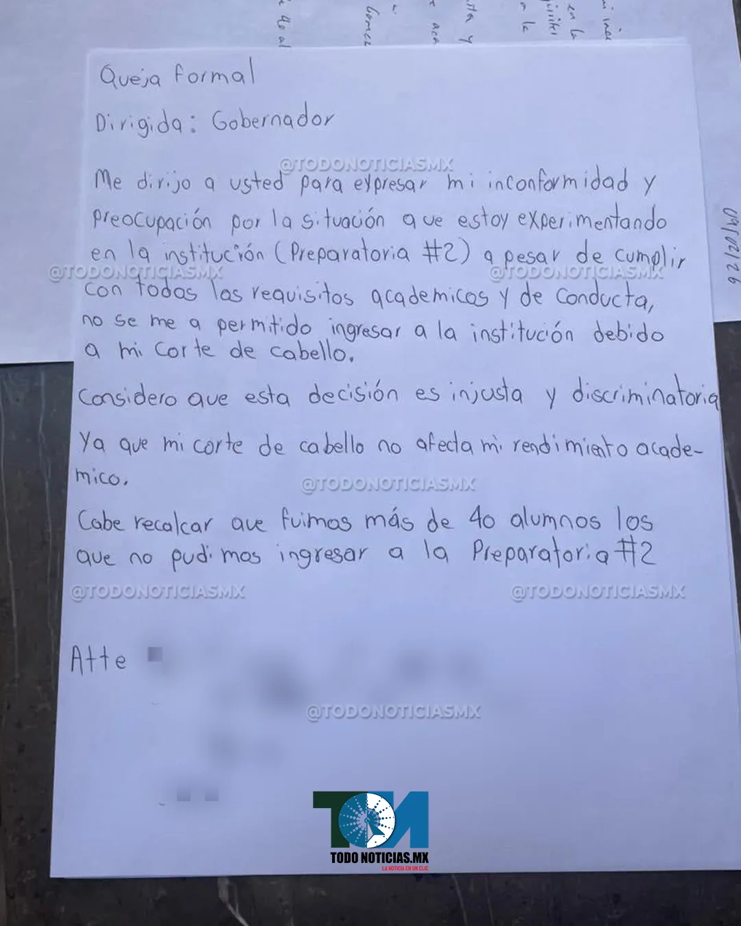 “Me dirijo a usted para expresar mi inconformidad y preocupación por la situación que estoy experimentando en la institución (Preparatoria #2) a pesar de cumplir con todos los requisitos académicos y de conducta, no se me ha permitido ingresar a institución debido a mi corte de cabello”.