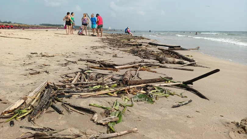 Madero, Tam.- Toneladas de palizada, ramas y desechos arrastrados por la creciente del río Pánuco cubrieron gran parte de Playa Miramar, provocando la suspensión temporal de actividades recreativas y el izamiento de la bandera negra en la torre de vigilancia principal, debido al riesgo que representa adentrarse al mar.