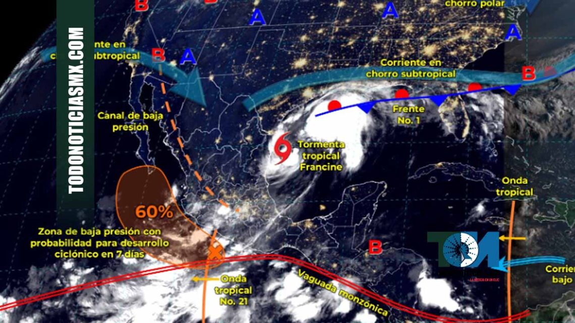 El Servicio Meteorológico Nacional (SMN) informó que este martes 10 de septiembre, la tormenta tropical “Francine” podría intensificarse a huracán categoría 1. El fenómeno se moverá frente a la costa norte de Tamaulipas, provocando lluvias intensas en el estado, así como en Nuevo León y San Luis Potosí, acompañadas de fuertes vientos, oleaje elevado y la posible formación de trombas marinas en las costas tamaulipecas.