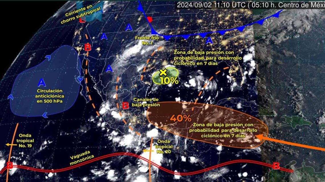 Por otra parte, la onda tropical número 20 se desplazará sobre el centro y sur del territorio nacional, interaccionará con canales de baja presión sobre el occidente y sureste de México, y con el ingreso de humedad de ambos océanos, originará lluvias fuertes a puntuales muy fuertes en dichas regiones y en la península de Yucatán, así como lluvias intensas en Michoacán, Guerrero, Oaxaca, Chiapas y Yucatán.