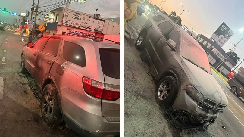 De acuerdo con los primeros reportes, el propietario había dejado estacionada desde la noche anterior una Dodge Durango color arena, marcada con el símbolo de venta, con la intención de ofrecerla a primera hora del día, sin embargo, antes del amanecer, la unidad comenzó a arder en llamas.