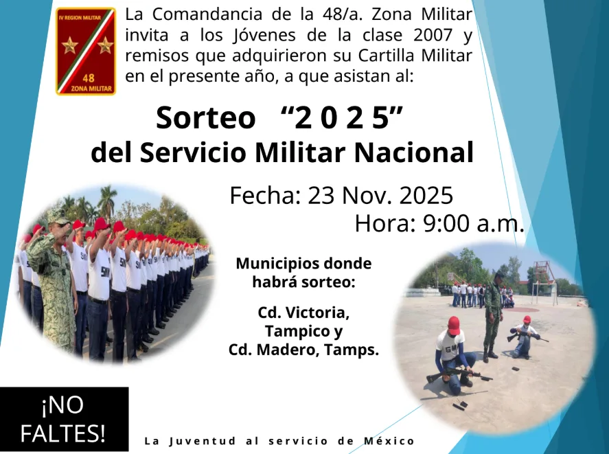 Ciudad Victoria, Tamaulipas.- La Secretaría de la Defensa Nacional (SEDENA) informó que el próximo domingo 23 de noviembre de 2025 se llevará a cabo el Sorteo del Servicio Militar Nacional, dirigido a los jóvenes nacidos en 2005, así como a aquellos que se encuentran en condición de remisos, es decir, quienes no han cumplido con esta obligación en años anteriores.
