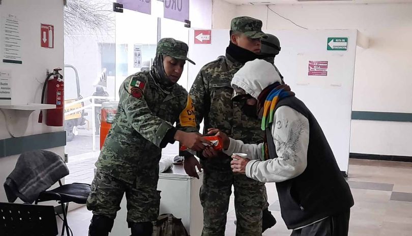 Los elementos de la Sedena repartieron pan y atole en albergues, calles y lugares públicos ante la ola de frío imperante en el Estado de Tamaulipas.
