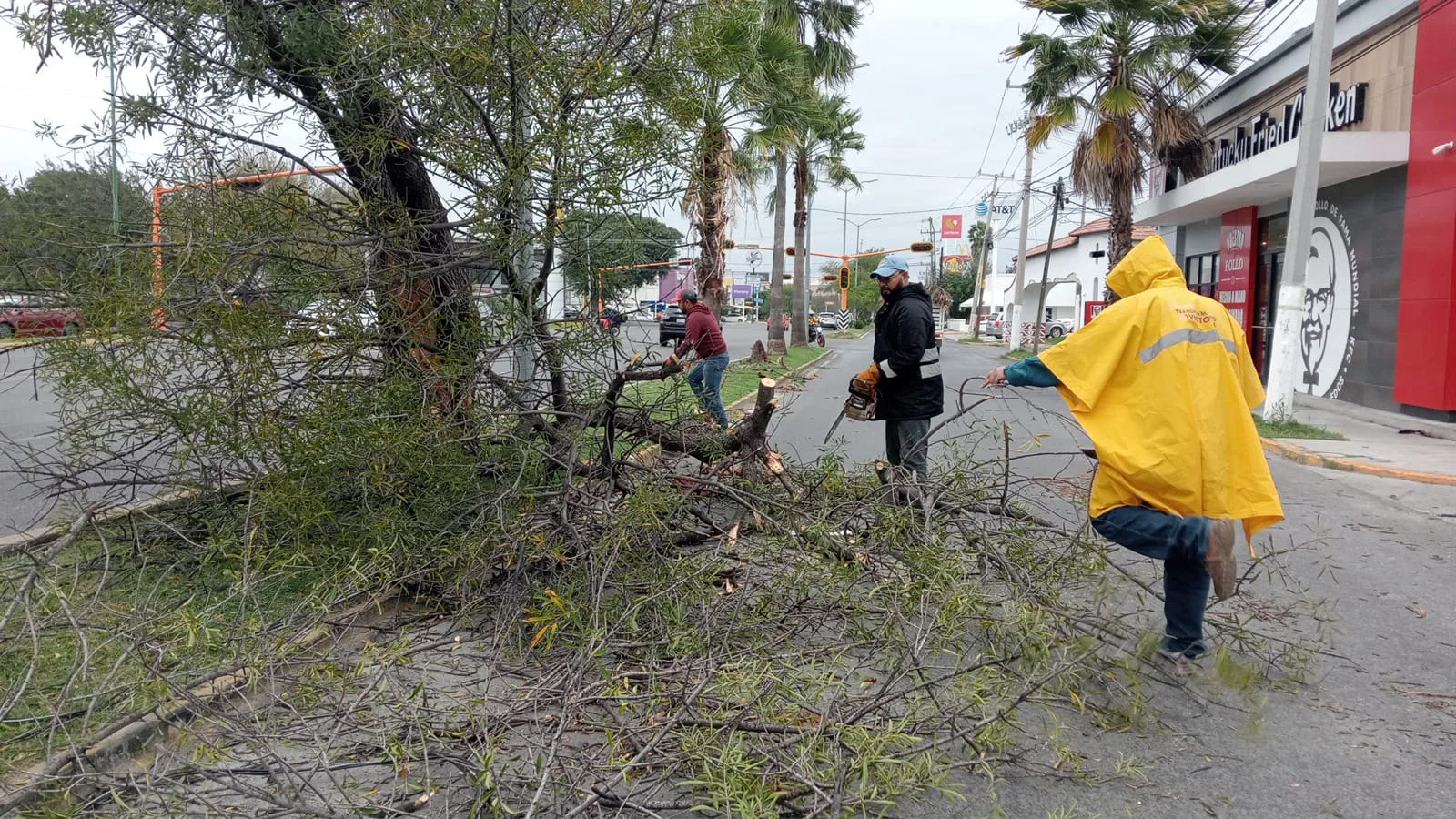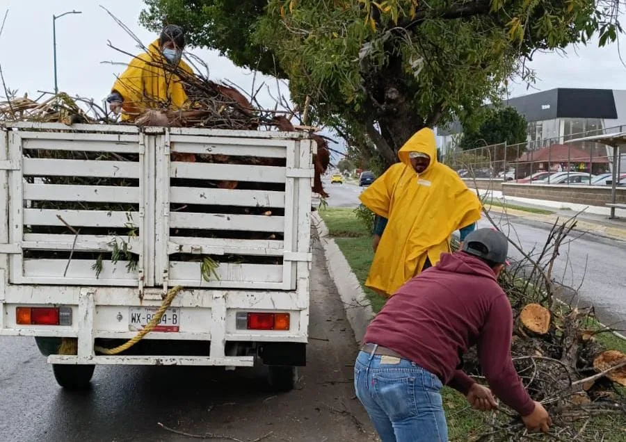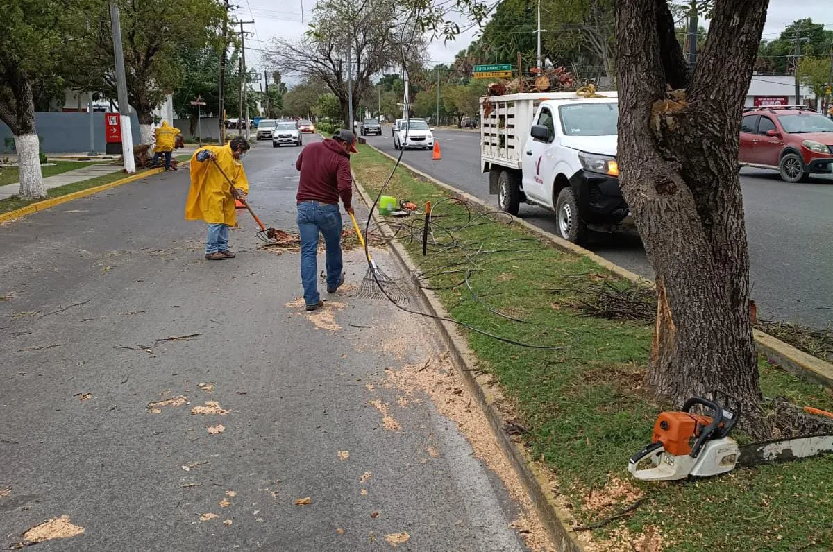 Personal de Protección Civil, Parques y Jardines de Servicios Públicos y Desarrollo Urbano, realizaron trabajos de poda y retiro de árboles caídos en la calle 7 Ceros Hidalgo y Juárez; avenida 24, calle Esmeralda de la colonia Loma Alta y 9 y 10 Canales de la colonia Mainero.