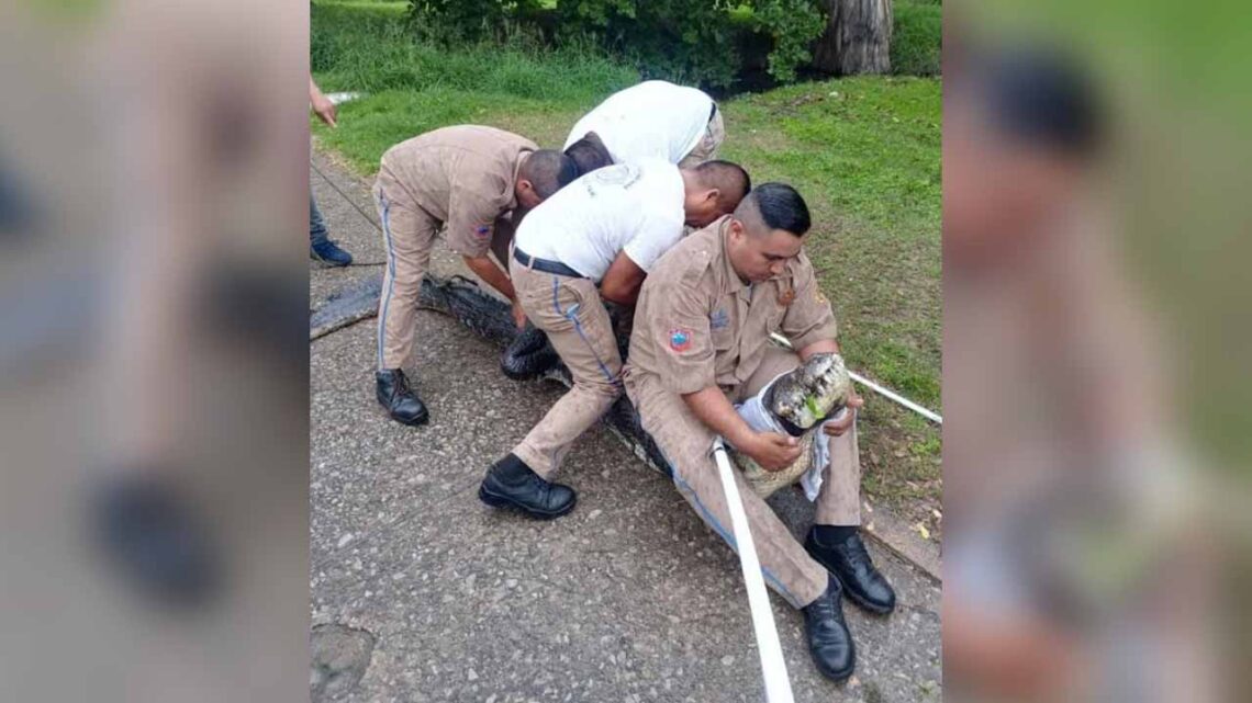 Tampico, Tamaulipas.- Un cocodrilo de casi tres metros de longitud fue capturado por elementos del cuerpo de Bomberos de Tampico, tras haber sido avistado merodeando en los terrenos del parque metropolitano de la Laguna del Carpintero.