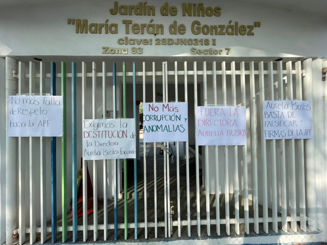 Ciudad Victoria, Tamaulipas.- Padres y madres de familia cerraron con cadenas y candados los accesos al Jardín de Niños María Terán de González para exigir la destitución de la directora Aurelia Bustos Facundo, al considerar que dispuso de manera inapropiada dinero obtenido por cuotas escolares en el actual ciclo escolar.
