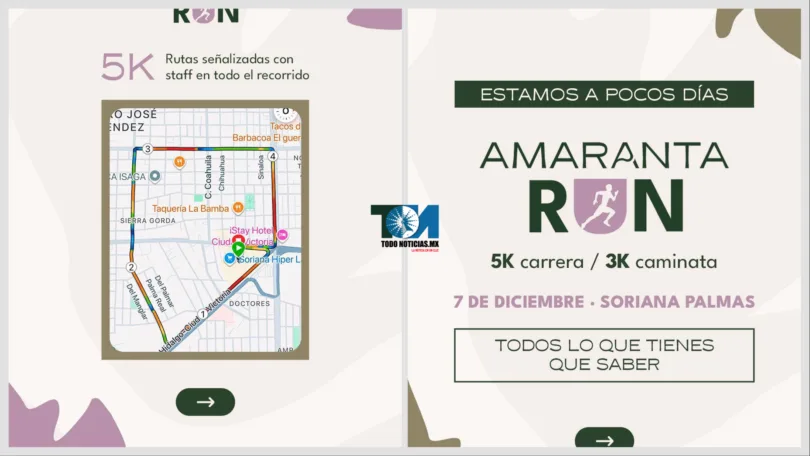 La primera edición de la Amaranta Run está oficialmente programada para el próximo domingo 7 de diciembre. El punto de encuentro y partida es la zona de Soriana Palmas.