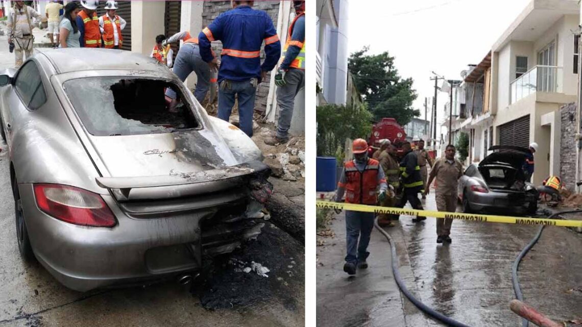 Tampico, Tamaulipas.- Un carro deportivo de la marca Porsche 718 Caimán edición especial quedó completamente inservible tras ser alcanzado por un flamazo ocasionado por una fuga de gas en una toma domiciliaria, de la cual, la propietaria ya había reportado a la empresa responsable desde el sábado por la noche.