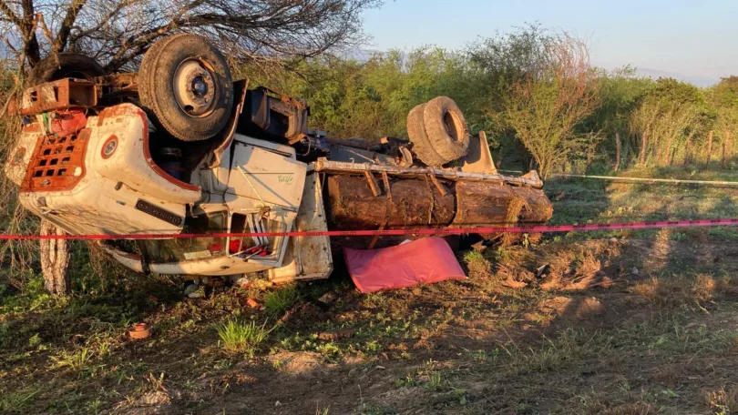 Lamentablemente, en el percance perdió la vida un trabajador que viajaba aparentemente trepado sobre la plataforma junto a la carga de troncos.