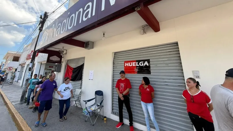 Tampico, Tamaulipas.-Las sucursales del Monte de Piedad en Tampico, Ciudad Madero y Altamira amanecieron este martes con banderas rojinegras, luego de que los empleados decidieran iniciar una huelga en demanda de mejores condiciones laborales y respeto a su contrato colectivo.