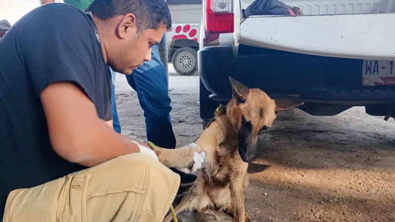 De acuerdo con el reporte, la perrita se encontraba visiblemente desnutrida y llevaba un mecate amarrado al cuello, situación que llamó la atención de los rescatistas.