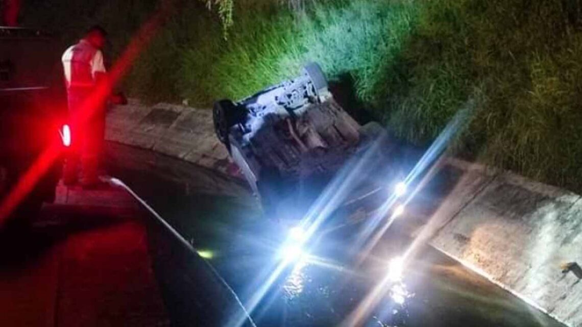 Se trata de una camioneta de la marca KIAla que terminó volcada con las cuatro llantas hacia arriba en el fondo de un canal.