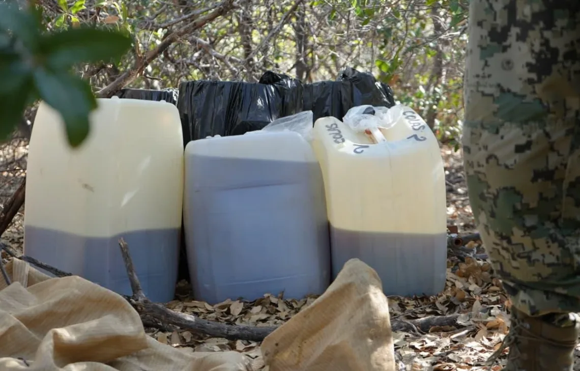 El sitio estaba oculto entre la vegetación y el terreno rocoso de la región. En el lugar se localizaron áreas destinadas a la elaboración de la droga, almacenamiento de sustancias, un campamento, tanques de gas, fosas sépticas, así como bidones, tambos, precursores químicos y otros insumos utilizados en la producción de metanfetamina.