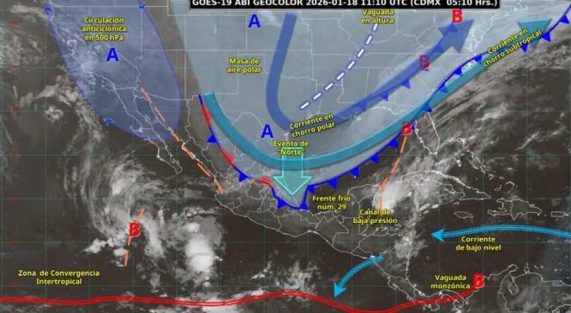 El panorama del clima para este domingo 18 de enero es adverso en varias regiones de México. El Servicio Meteorológico Nacional (SMN) informó que el avance del frente frío número 29 sobre el sureste del país y la península de Yucatán, junto con su masa de aire polar, ocasionará lluvias intensas, vientos fuertes tipo “Norte” y un marcado descenso de las temperaturas.