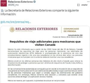 El requisito entrará en vigor desde este jueves 29 de febrero a las 11:30 horas, de modo que se incrementan las exigencias de viaje. En las últimas semanas la SRE envió dos misiones de alto nivel a Canadá para refrendar el compromiso con aquellas personas que son víctimas de fraude, trata, desinformación y tráfico.