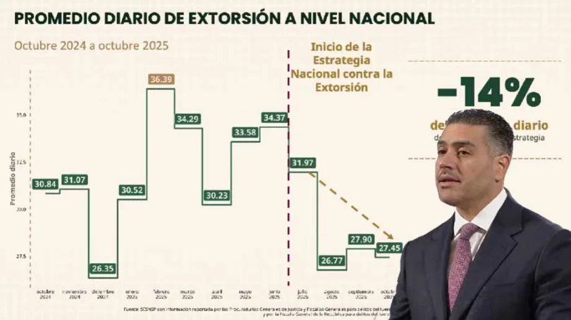 Respecto al delito de extorsión, García Harfuch señaló que se ha reducido en 14% desde que entró en vigor la Estrategia Nacional contra la Extorsión, implementada el pasado 6 de julio. El funcionario explicó que 12 centros penitenciarios concentran el 56% de las líneas telefónicas usadas para extorsionar, por lo que se puso en marcha un plan específico para neutralizar estas operaciones.