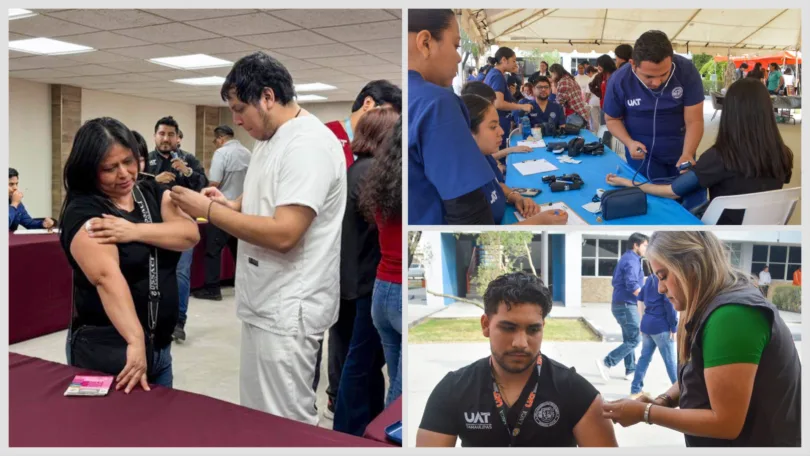 La Universidad Autónoma de Tamaulipas (UAT), en coordinación con la Secretaría de Salud, lleva a cabo exitosas jornadas de vacunación en las instalaciones universitarias de Reynosa, ampliando el acceso a servicios preventivos para estudiantes, docentes, trabajadores y sus familias.